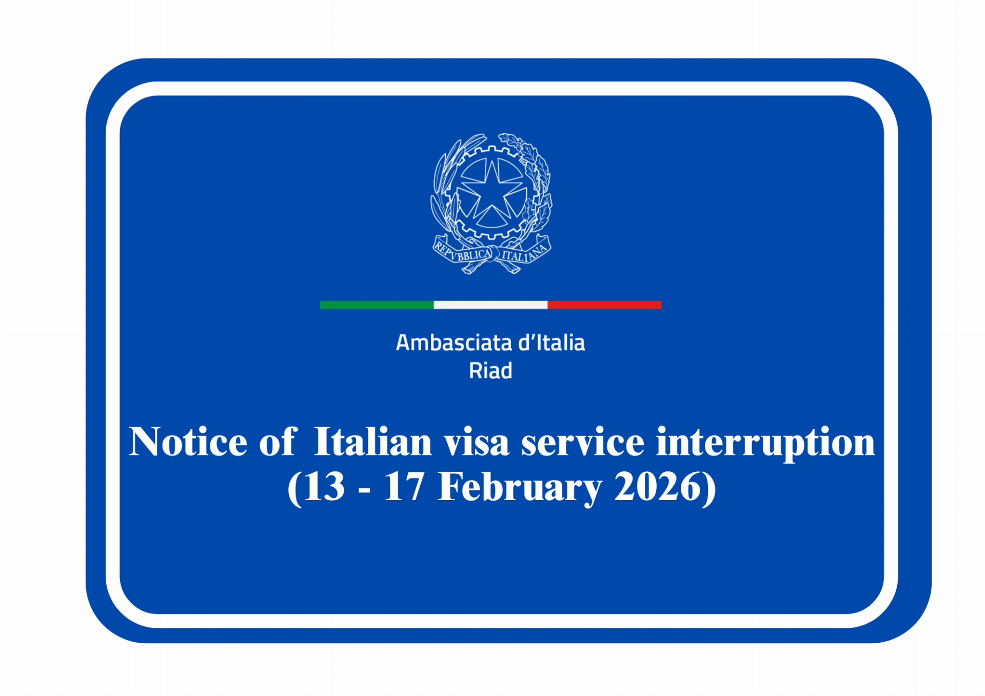 Notice of Italian visa service interruption, 13 - 17 February 2026
